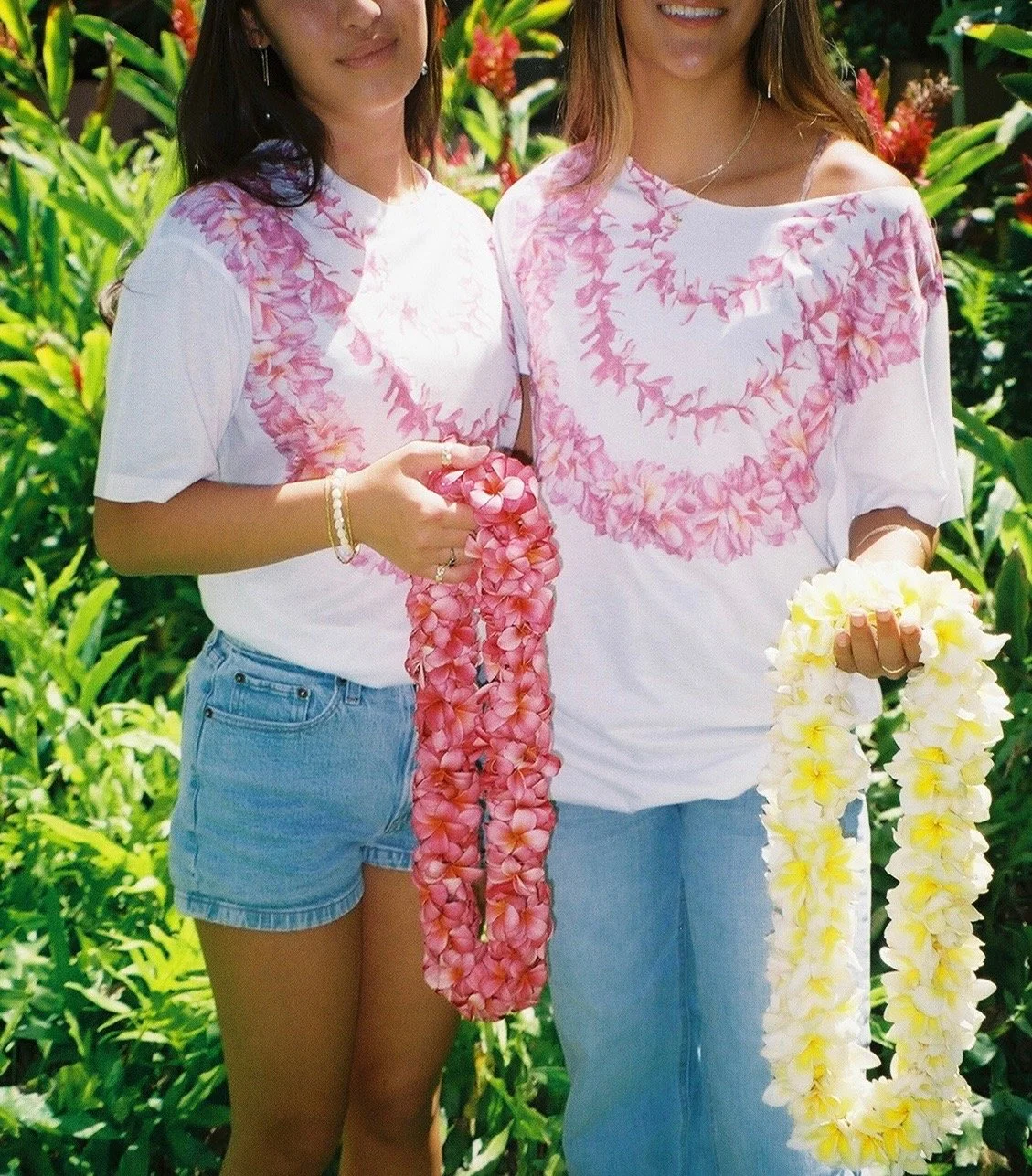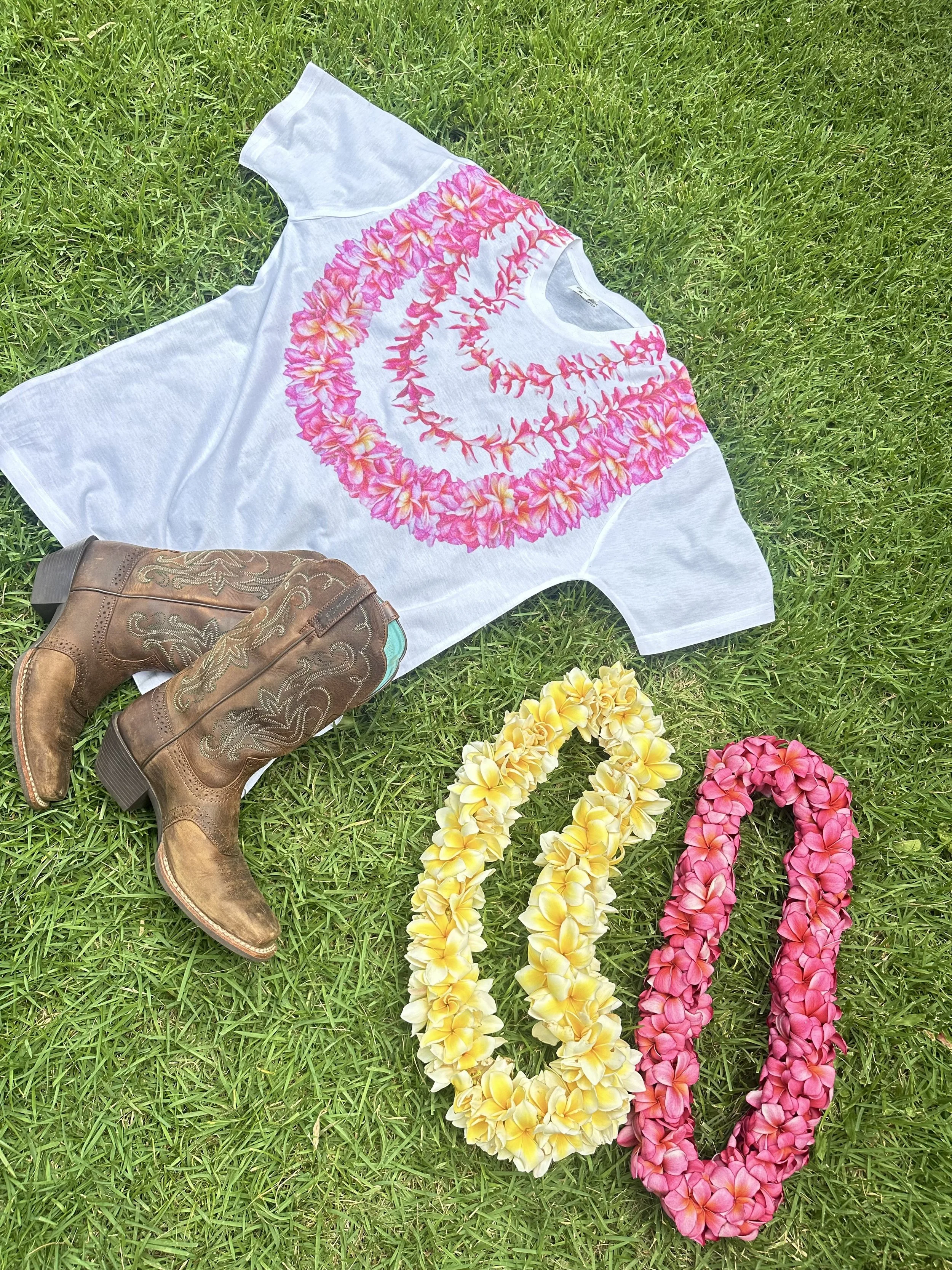 Pink plumeria lei shirt - designed to look filmy and slightly distressed.